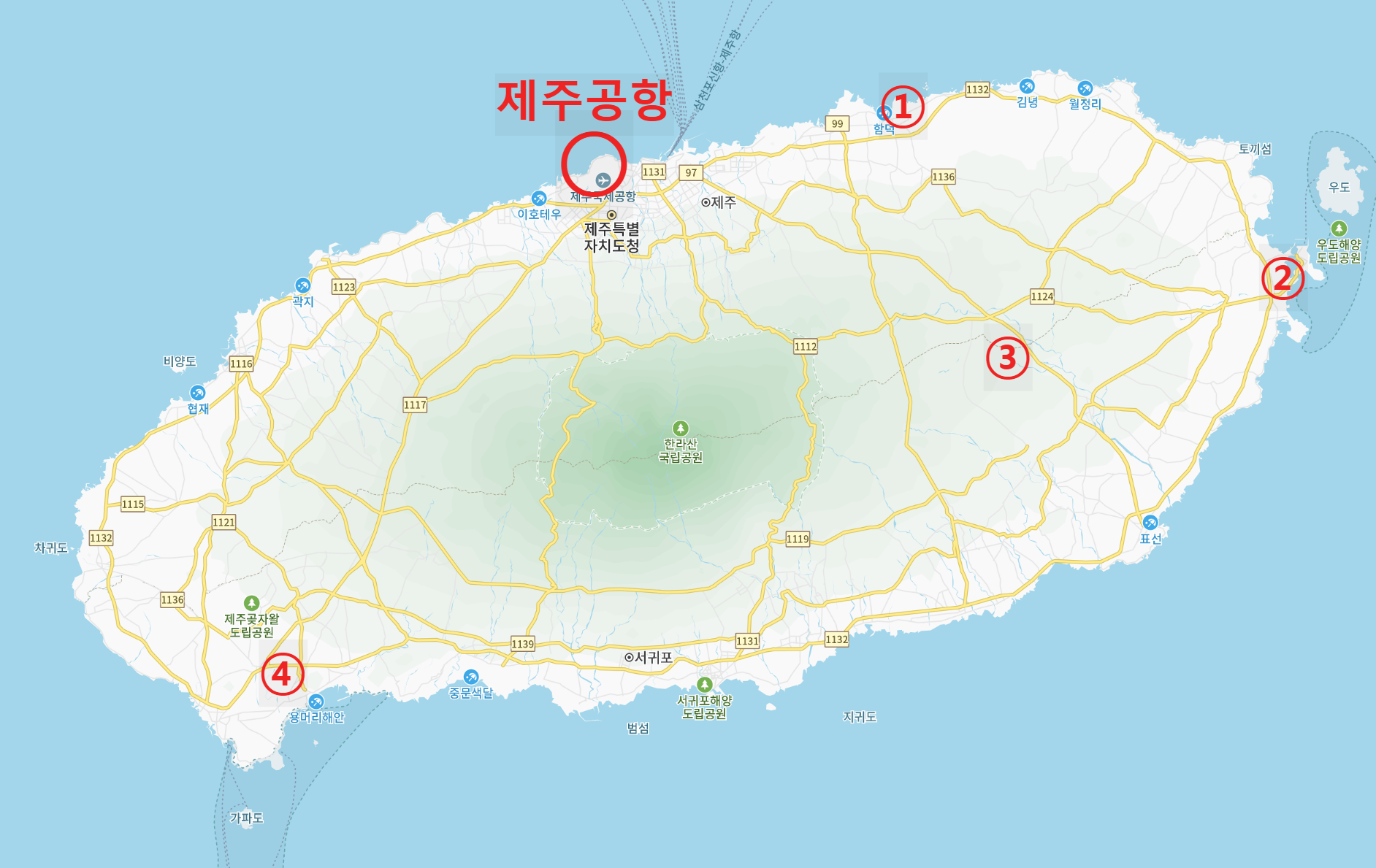제주공항 기준으로 시계 방향 순서대로 소개해 드리겠습니다