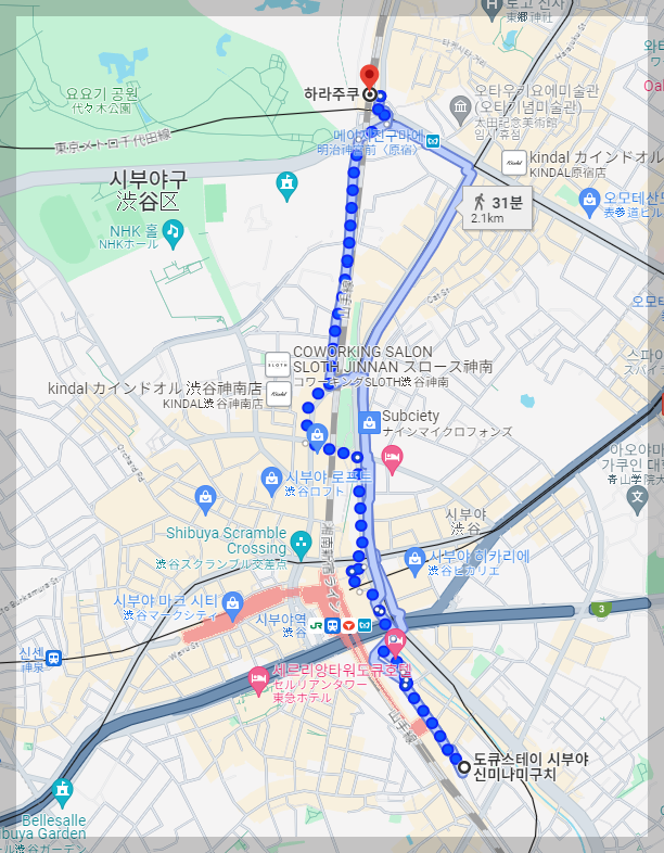 호텔에서 조금 휴식을 하고, 호텔에서 하라주쿠역까지 가는 길을 구글맵 검색해보니, 지하철은 도보 포함 13분,  도보는 31분 소요된다고 검색됐습니다. 원래 첫 째날에는 지하철 탈 계획이 없었는데, 아침부터 캐리어를 끌고 이동하다 보니까 더 지치기도 했고, 생각보다 시간도 많이 늦어져 바로 쇼핑 동선의 출발지인 하라주쿠역까지 지하철을 타고 이동했습니다.