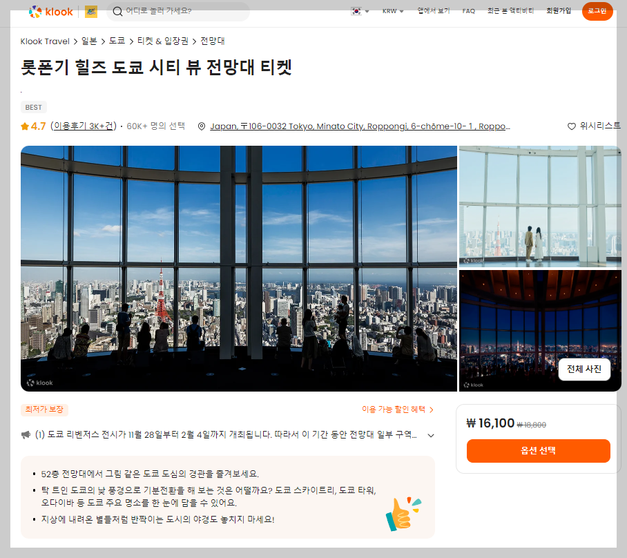 저희는 구매대행사이트를 이용해 롯폰기 힐즈 전망대 티켓을 구매했습니다. 한국에서 미리 클룩을 통해 티켓을 구매하고, 모바일로 QR코드를 발급받아 현장의 인포메이션 데스크에서 실물 티켓으로 교환했습니다.