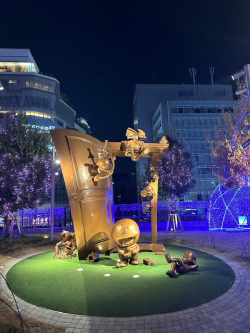 옥상 한가운데 <도라에몽과 도라에몽의 '어디로든 문'> 동상이 있어요