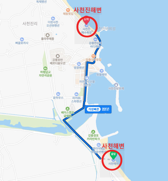 사천진해변 ↔ 사천해변(위치)