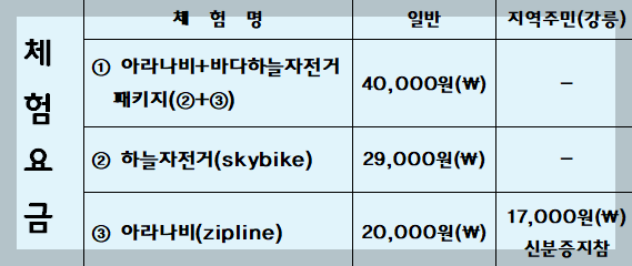 - 아라나비(짚라인)와 하늘자전거 둘 다 경험할 때는 패키지 할인!