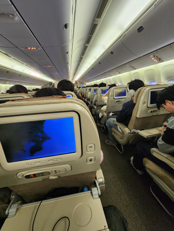 여행 첫 날 나리타 행 비행기 좌석은 온라인 체크인을 일찍 해서 앞쪽 5번째 줄 좌석에 앉을 수 있었는데, 이번에는 온라인체크인을 하루 전에 했더니 앞에서 10번째 줄 좌석에 앉았습니다.