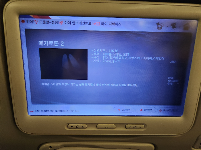 이번 인천행 아시아나 비행기(OZ0103편)도 일본 여행 첫날 탔던 OZ0102편과 마찬가지로 다양한 영상 컨텐츠를 볼 수 있었습니다.