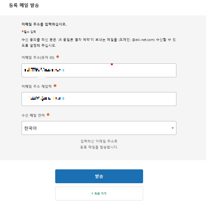 약관에 동의 하시고, 다음 단계에서 이메일 주소를 입력하고, '발송'버튼 클릭합니다.