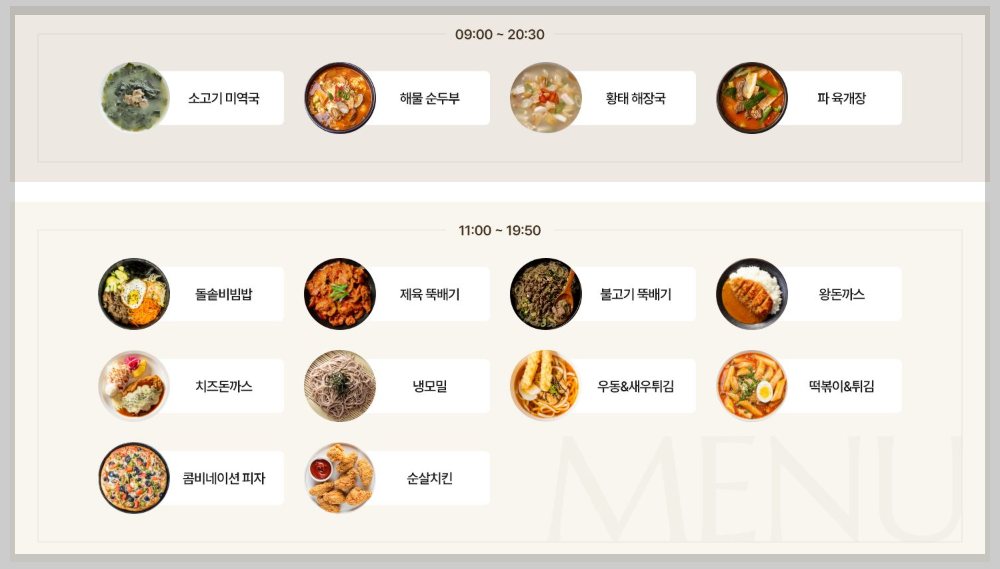 메뉴마다 가능한 시간이 다르게 나와있습니다.