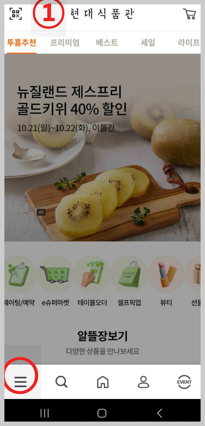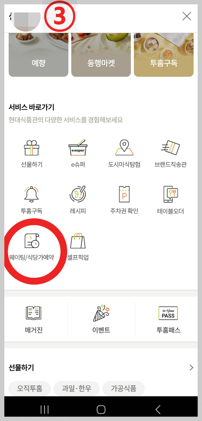 ● 현대식품관 앱에 접속하자마자 보이는 메인(홈) 화면에 '웨이팅/예약' 아이콘을 클릭합니다.