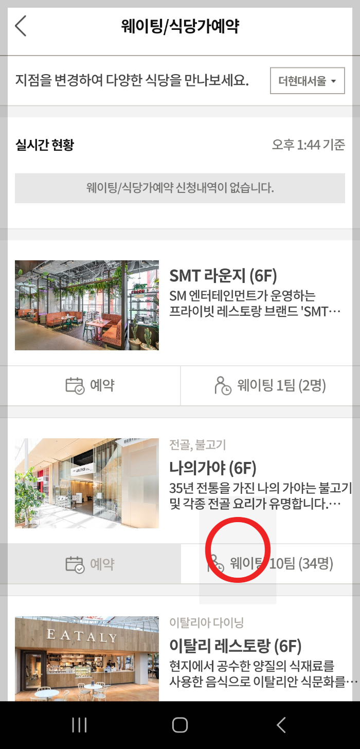 '웨이팅/식당가 예약'화면에서 원하는 가게의