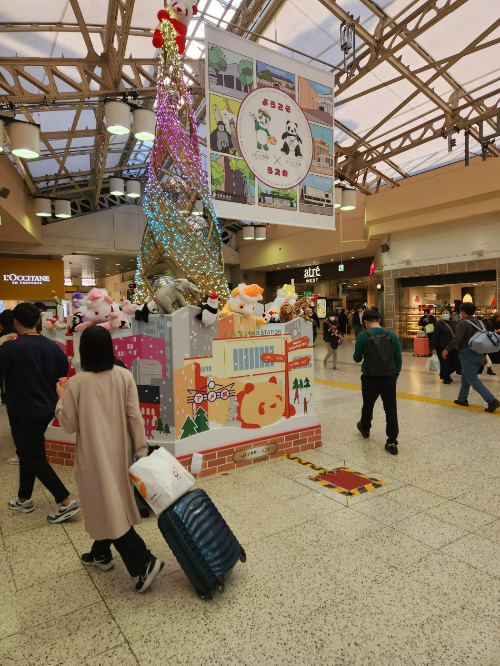아사쿠사역에서 다시 긴자선을 타고 3개의 정거장을 지나 우에노역에 도착했습니다. 우에노 역 중앙에는 크리스마스트리와 우에노 동물원의 시그니쳐인 판다 장식들이 눈에 띄었습니다.