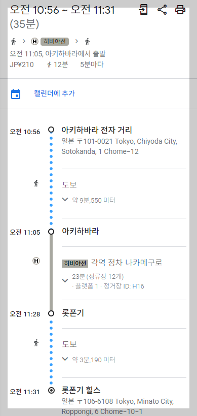 도쿄메트로 노선인 회색 히비야선의 아키하바라역에서 출발해 12개 정류장을 지나 롯폰기역으로 향했습니다.
