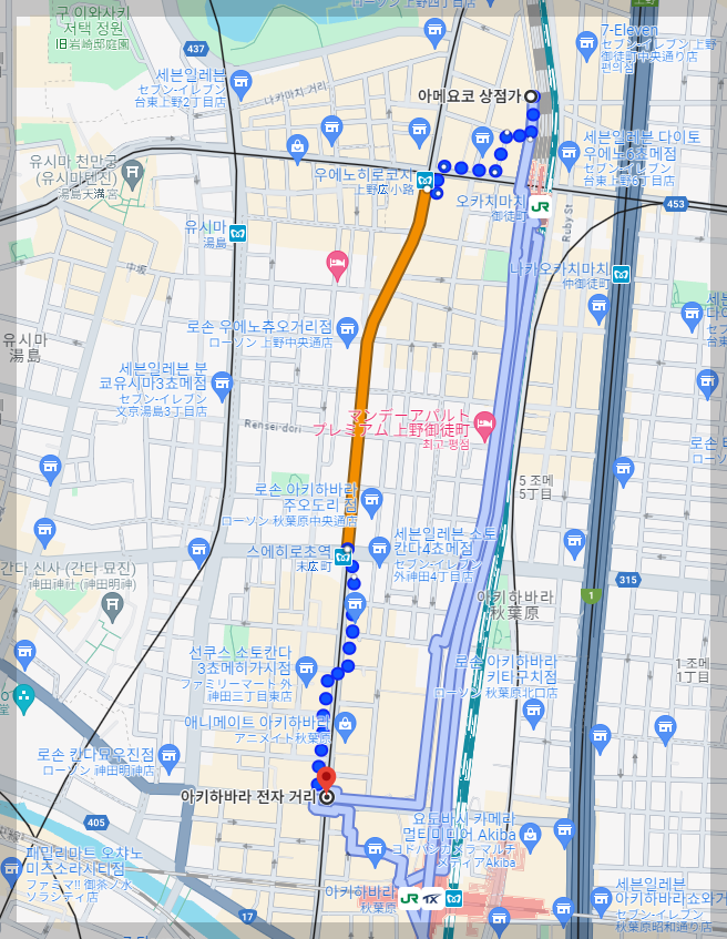 우에노의 야메요코 상점가에서 아키하바라 전자상가까지는 지하철로 1 정거장이었으며, 도보거리는 1.2km입니다.