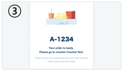 ③ 푸시 알림을 받으면 상품 수령 주문한 상품이 준비되면 수령 카운터 번호가 앱상에 표시됩니다. 지정 카운터에서 수령 번호가 표시된 앱 화면을 제시하시고 주문한 메뉴를 받아가면 됩니다.