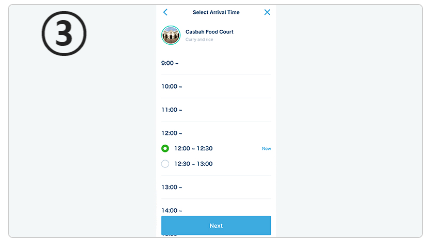 ③ 식사하고 싶은 시간을 선택합니다. 선택할 수 없는 시간은 'Not Available'(선택 불가) 또는 'Out of Stock'(재고 없음)으로 표시됩니다.