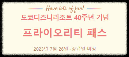도쿄 디즈니 리조트의 40주년 기념 이벤트는 24년 3월부로 종료되지만 이 40주년 기념 프라이오리티 패스권 이벤트 종료일은 아직 미정입니다.
