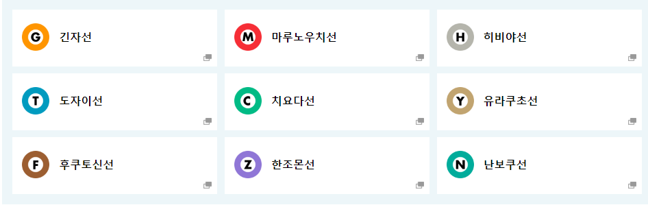 :긴자선, 마루노우치선, 히비야선, 도자이선, 치요다선, 유라쿠초선, 후쿠토신선, 한조몬선, 난보쿠선