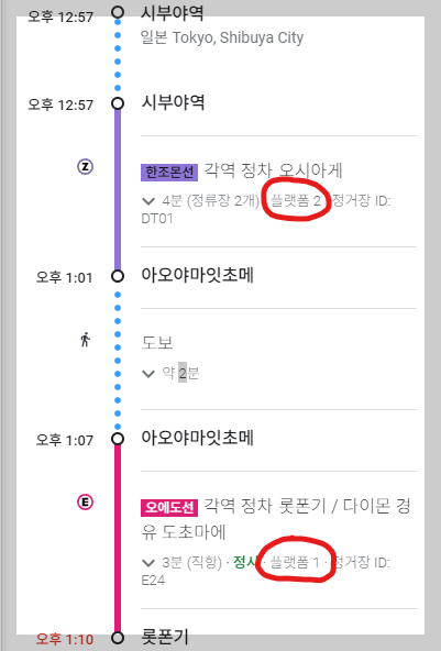 예를들어 시부야역에서 롯폰기역을 구글맵으로로 검색을 하게되면,