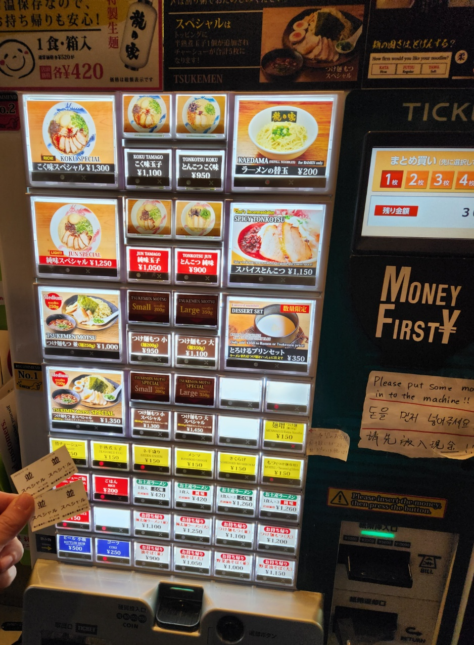웨이팅을 하고 있으면 직원이 나와서 한 팀씩 가게로 들어가 라면자판기에서 미리 식권을 결제를 할 수 있도록 안내해줍니다. 이 때 주문이 들어가는건 아니고 자판기에서 결제한 식권을 가지고 다시 나와서 웨이팅을 했습니다.