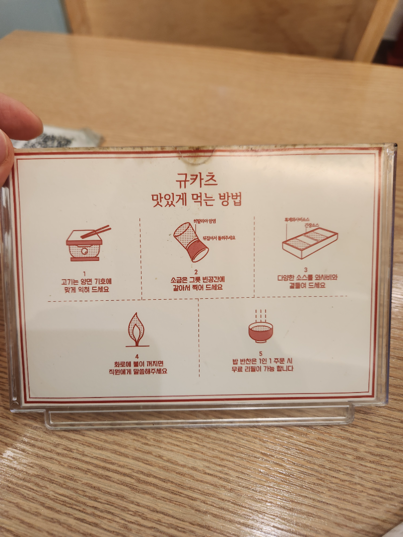 테이블마다 있는 '규카츠 맛있게 먹는 방법' 안내판에