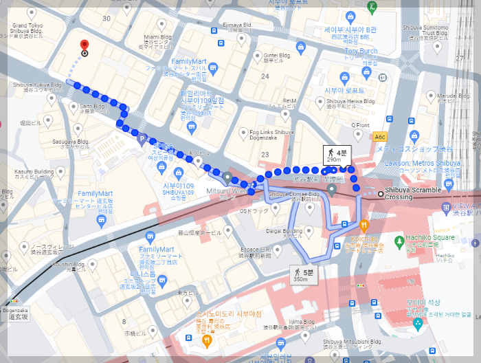 구글맵으로 시부야 스크램블 교차로부터 메가돈키호테 시부야본점까지 '길 찾기' 검색한 사진입니다.
