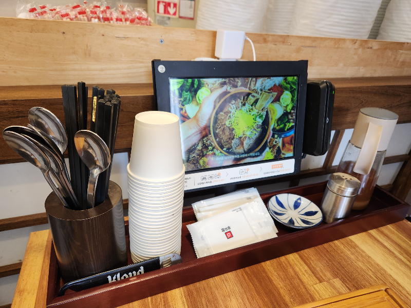 태블릿 키오스크와 수저, 종이컵, 물티슈,