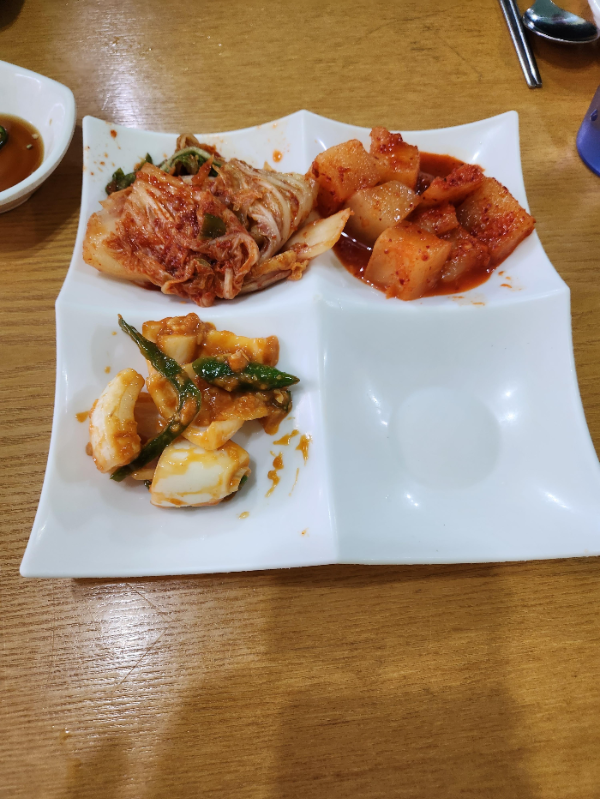 반찬이 먼저 셋팅되었습니다. 반찬은 김치, 깍두기, 양바 된장무침 3가지로 단출했습니다.