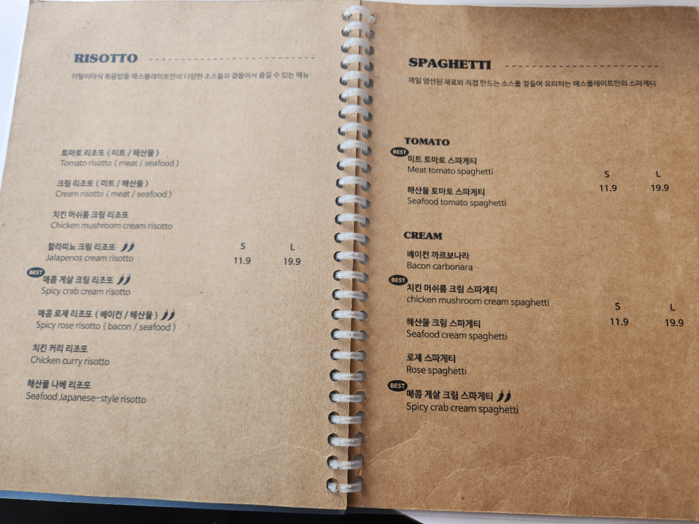 목살필라프 (L)로제 스파게티 (S)를 주문하고,
