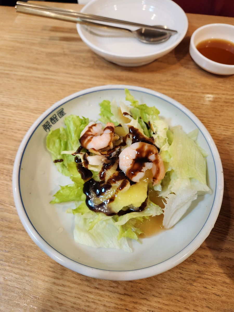 새우와 소라와 새콤달콤 발사믹 드레싱이 올라간 샐러드가