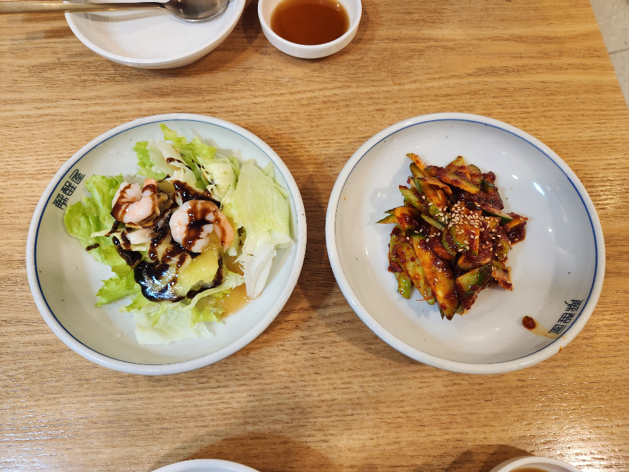 반찬으로 샐러드와 오이무침이 가장 먼저 나왔어요
