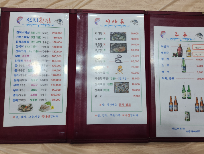 '신지횟집'의 메뉴판의