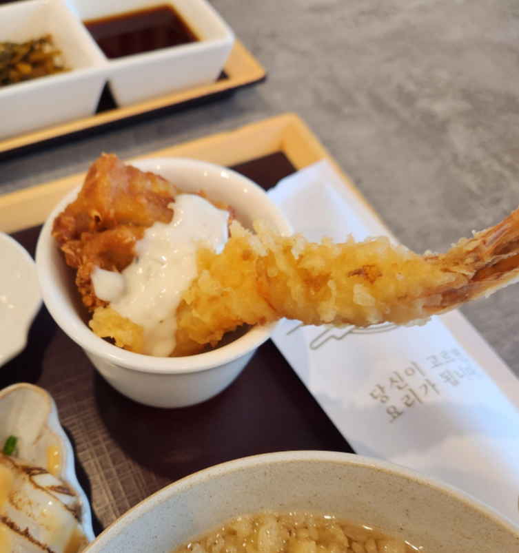 반우동과 왕새우튀김이 같이 나왔어요.