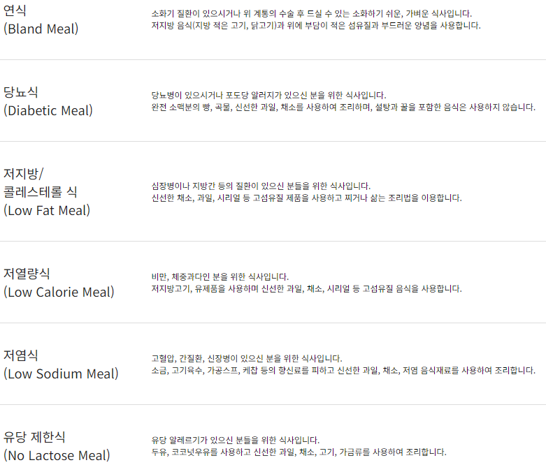 식이요법식은 연식, 당뇨식, 저지방/콜레스테롤 식, 저열량식, 저염식, 유당 제한식이 있습니다.