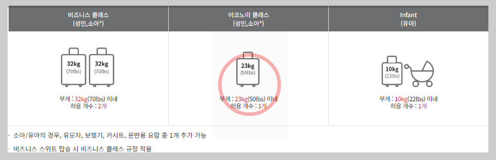 이코노미 클래스 : 23kg 이내 / 캐리어 1개