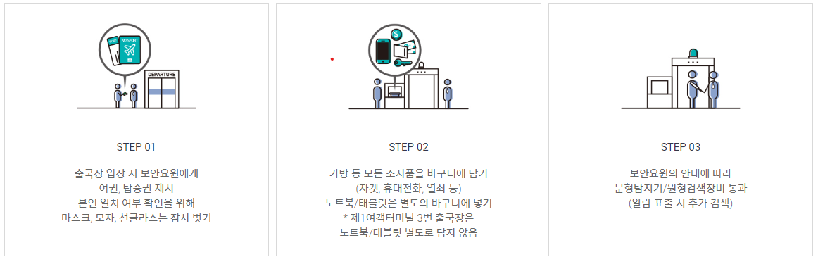 보안검색은 가방 등 모든 소지품을 바구니 안에 담고, 보안요원의 지시에 따라 보안검색대를 통과하면 됩니다.