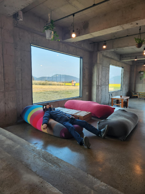 안 쪽에는 누울 수 있는 자리도 있어서 통유리 창에 비치는 유채꽃밭을 바라보며 여기 잠깐 누워서 휴식하고 갔답니다 ㅎㅎ