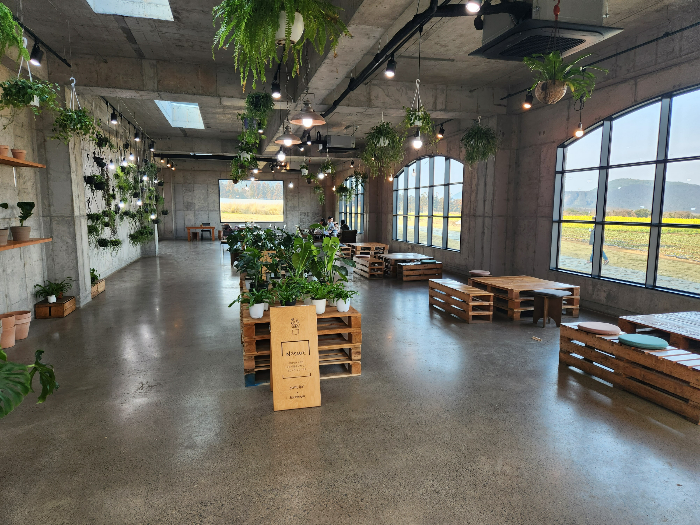 넓은 콘크리트 벽으로 되어 있는 공간에 커다란 통유리 창문, 그리고 식물과 조명들이 조화롭게 꾸며져 있었어요