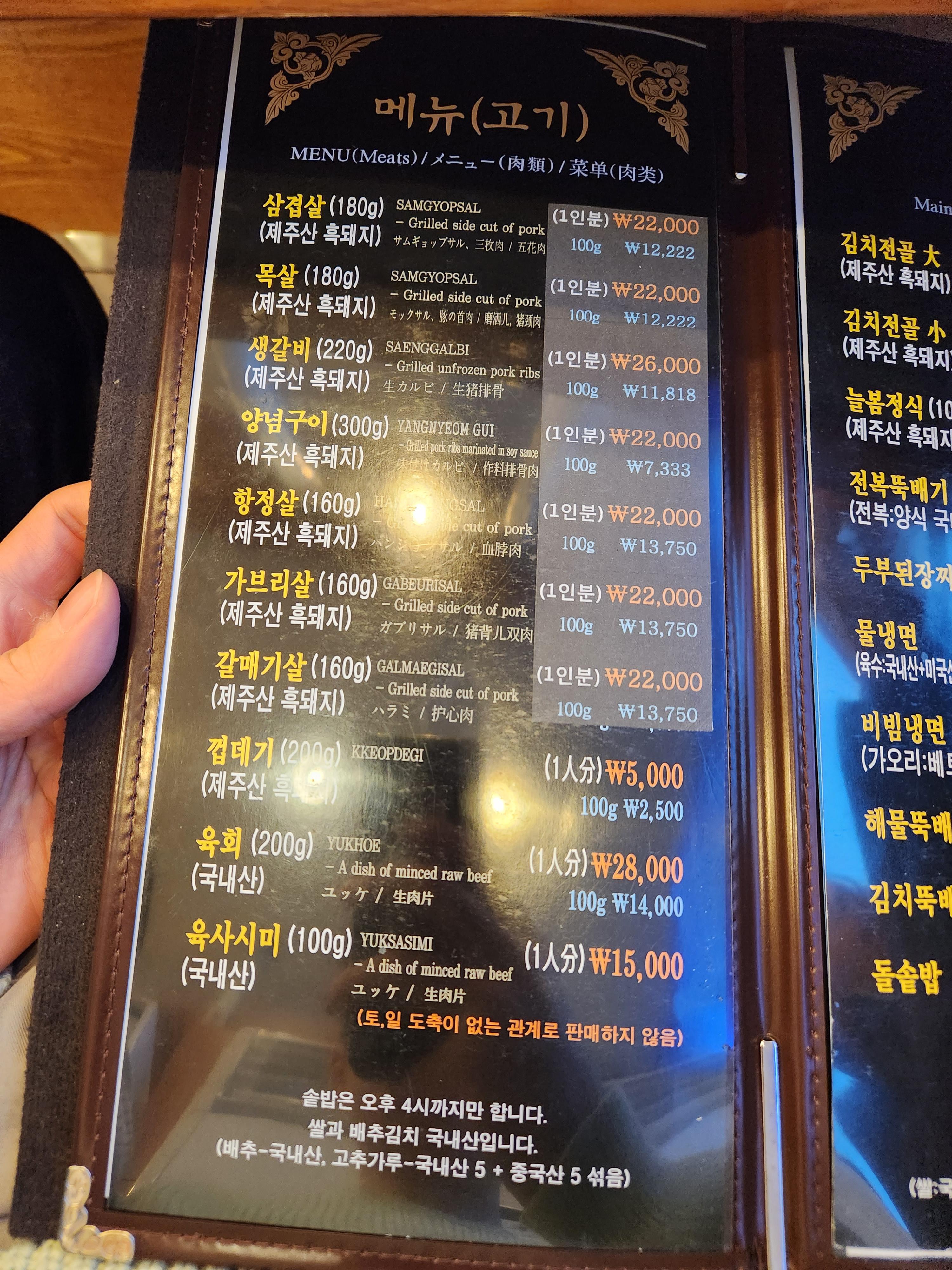 삼겹살과 목살, 항정살 등 흑돼지 메뉴는 1인분에 22000원이었고, 생갈비만 유일하게 1인분 기준 26000원이었습니다