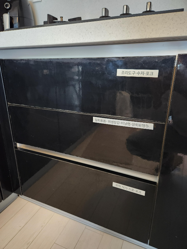 필요한 주방용품을 쉽게 찾을 수 있게 수납장마다 이름표가 붙어있더라고요