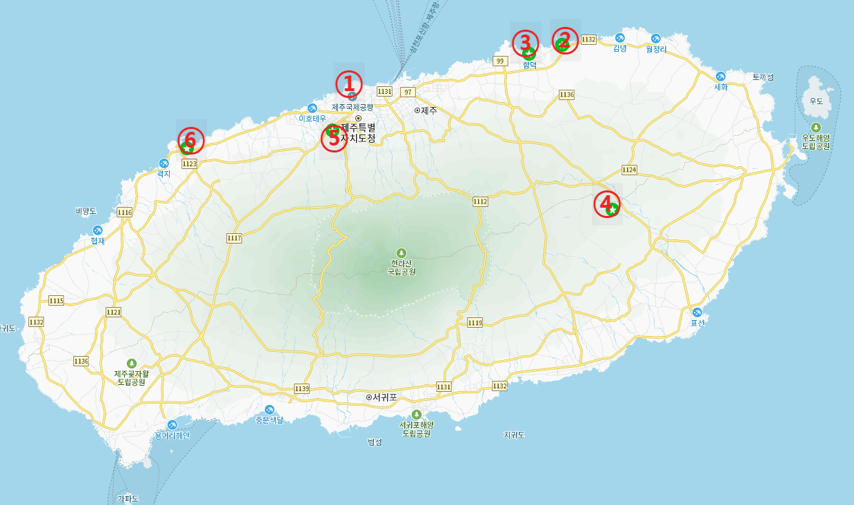 ① 제주공항 렌트 → ② 함덕(점심 식사) → ③ 함덕 (오션뷰 카페) → ④ 표선 (관광) → ⑤ 제주시(저녁 식사) → ⑥ 애월 (숙소 도착)