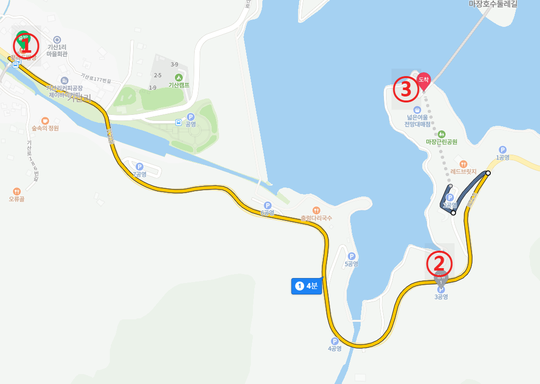 ① 마장호수 출렁다리 맛집(점심식사) → ② 마장호수 3 공영 주차장 → ③ 마장호수 출렁다리 입구