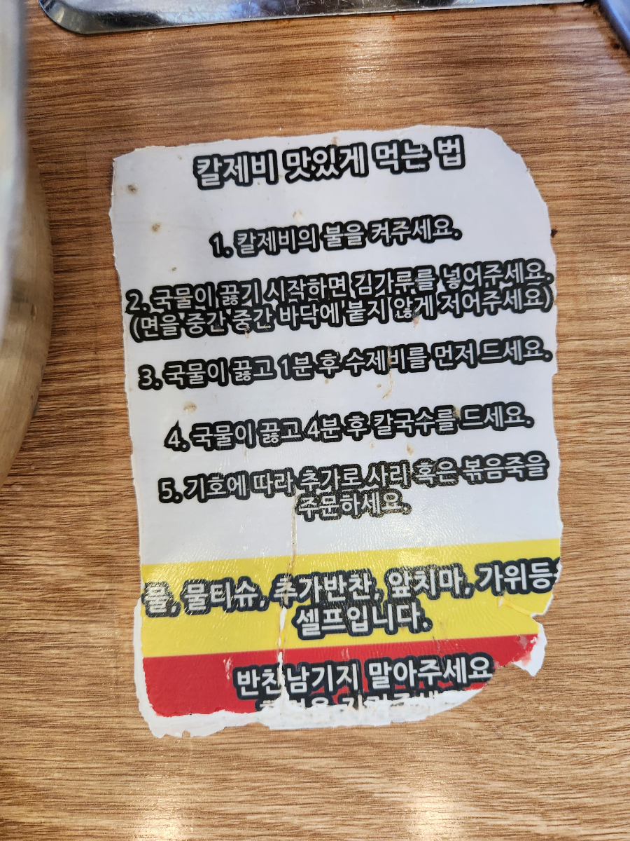 테이블마다 칼제비 맛있게 먹는 법이 적혀 있어서
