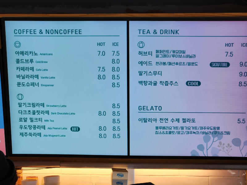 함덕해변 바로 앞에 위치하고 있는 좋은 자리 때문인지 음료 가격이 전체적으로 비싼 감이 있었어요