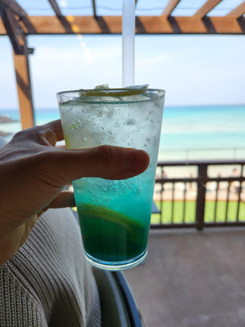 델문도의 시그니처 음료인 '델문도 에이드'는 블루 레몬에이드로 에메랄드 색깔의 함덕 바다를 담은듯한 음료였어요