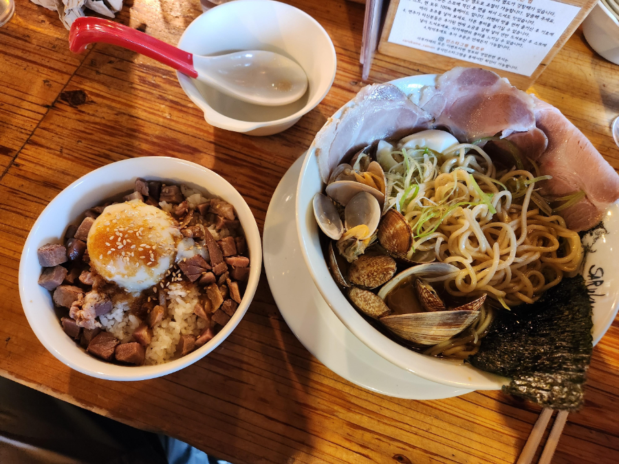 오픈런해야지 맛볼 수 있을 것 같네요.. 저희는 각자 명물 바지락 라멘과 스테미너동을 1개씩 주문했습니다.