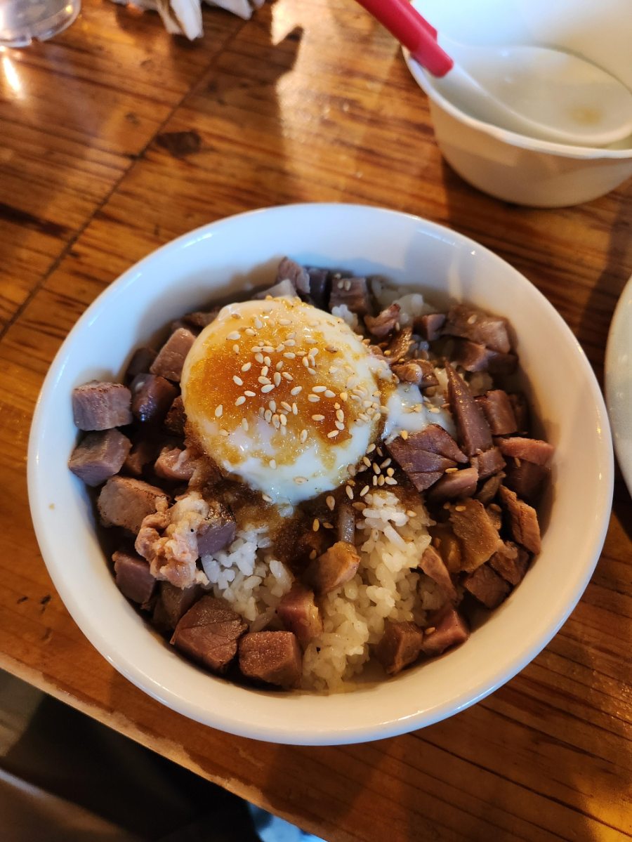 큐브모양의 차슈와 수란이 올라간 덮밥, 스테미너동이 나왔습니다.