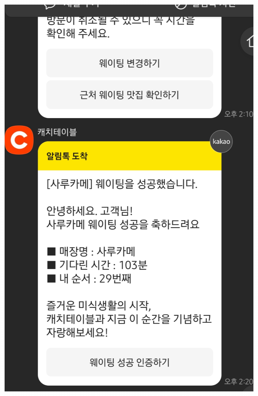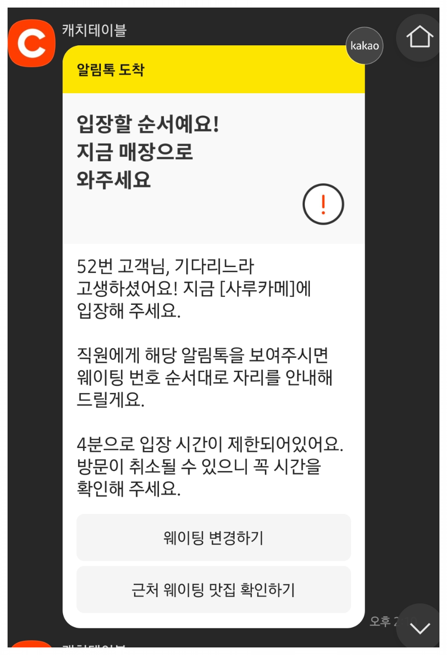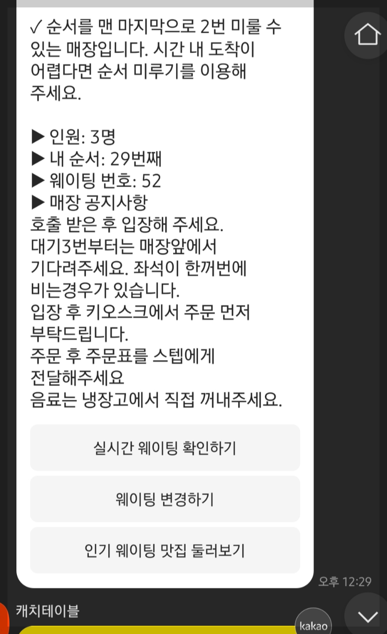 '캐치테이블' 어플로 웨이팅 등록하면 어플에서 확인할 수도 있지만