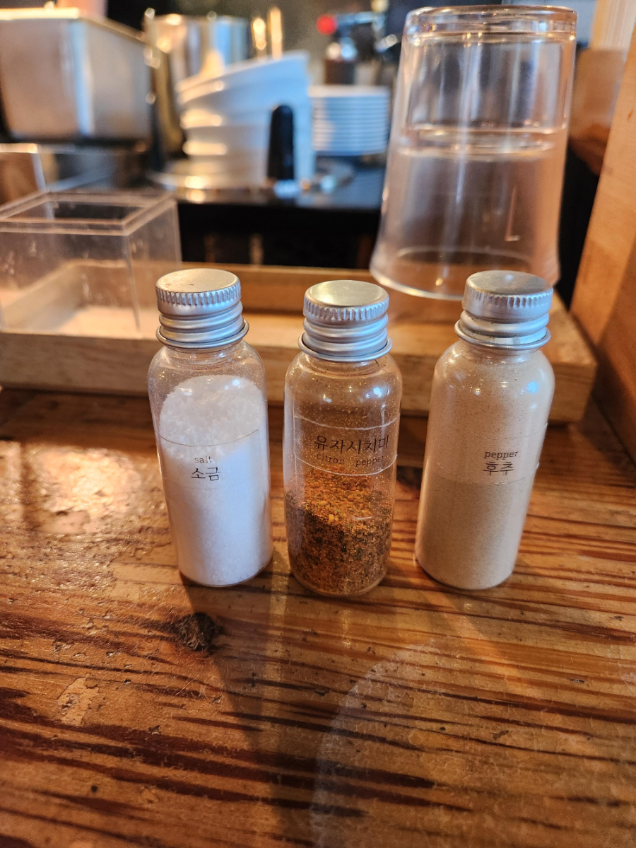 테이블마다 소금, 유자시치미, 후추 이렇게 3가지의 조미료가 비치되어 있는데 저는 사용하지 않았습니다.