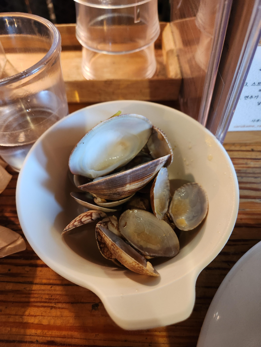 명물 바지락 라멘과 스테미너동까지 깔끔하게 완뚝하고 사진을 못 남겨서 아쉬운 대로 바지락 껍데기 사진만 남겨왔습니다. 웨이팅이 정말 길지만 라멘 육수에서부터 셰프님의 라멘에 대한 진심을 느낄 수 있었던 '사루카메'였습니다.