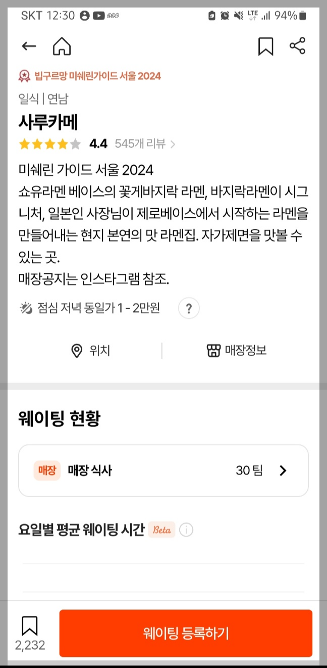 ☞ 연남동 라멘 맛집 '사루카메' 캐치테이블 웨이팅 확인하기 (바로가기)