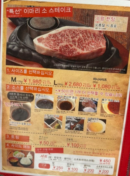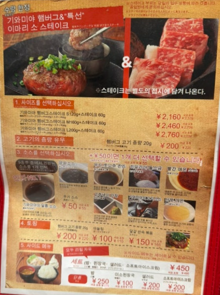 2) '키와미야 함바그+특선 이마리소 스테이크 세트'를 골랐고,