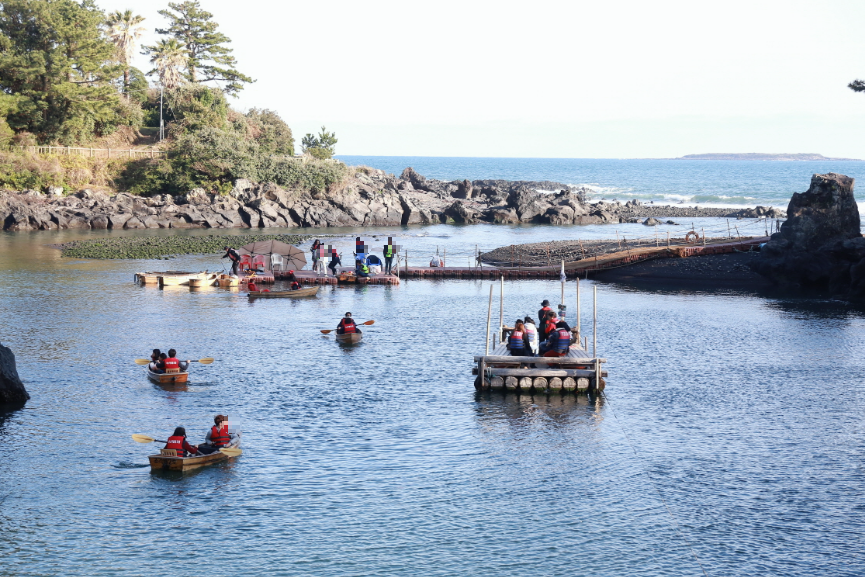 쇠소깍에서 카약이나 뗏목처럼 생긴 테우를